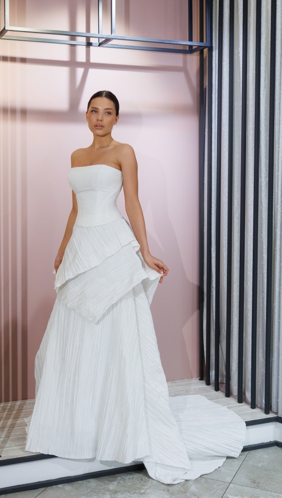 Изящное свадебное платье А-силуэта с открытыми плечиками и глубоким декольте. Небольшой шлейф. Платье богато расшито жемчугом, бисером и пайетками.